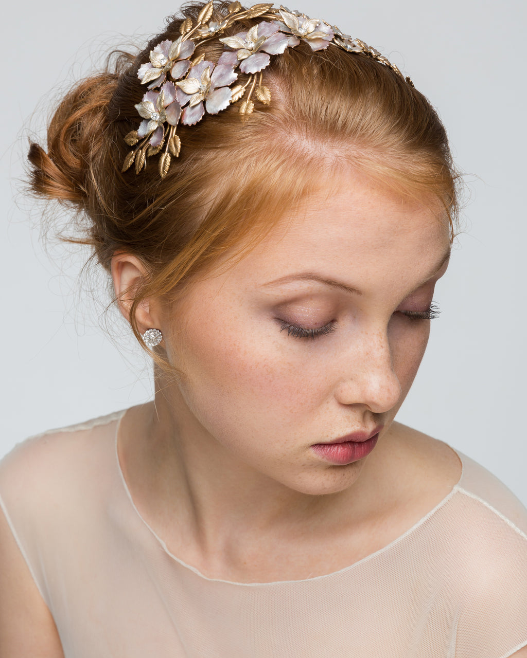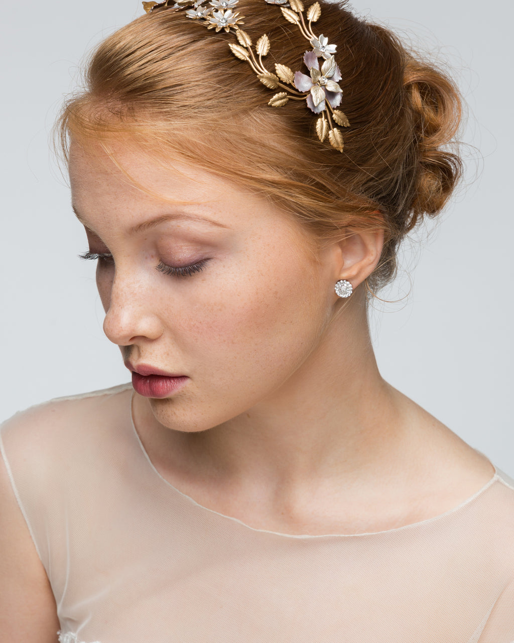 From our Luxe & Luminous Collection, this beautiful bridal headpiece is made using brass flowers & leaves, soldered together in our Melbourne workrooms. Diamond cut crystal centres with 24k Gold hand painted and finished with coats of pearl enamel. Boho Luxe Styling.